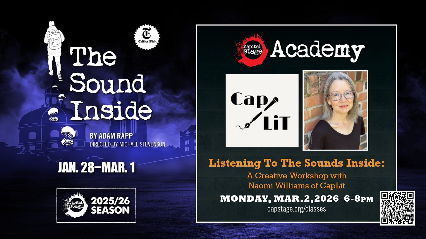 Take advantage of the generous 25% discount Cap Stage is offering our supporters to buy tickets for the play (use COMMUNITY25 at checkout). Then sign up to join a two-hour workshop inspired by the play, facilitated by our own Naomi Williams, on Monday, March 2, from 6-8pm at Studio 130 at CLARA. The workshop is offered on a “pay-what-you-will” basis, with a minimum donation of $5. Naomi is offering her time, and proceeds will be split between CapLit and Cap Stage.